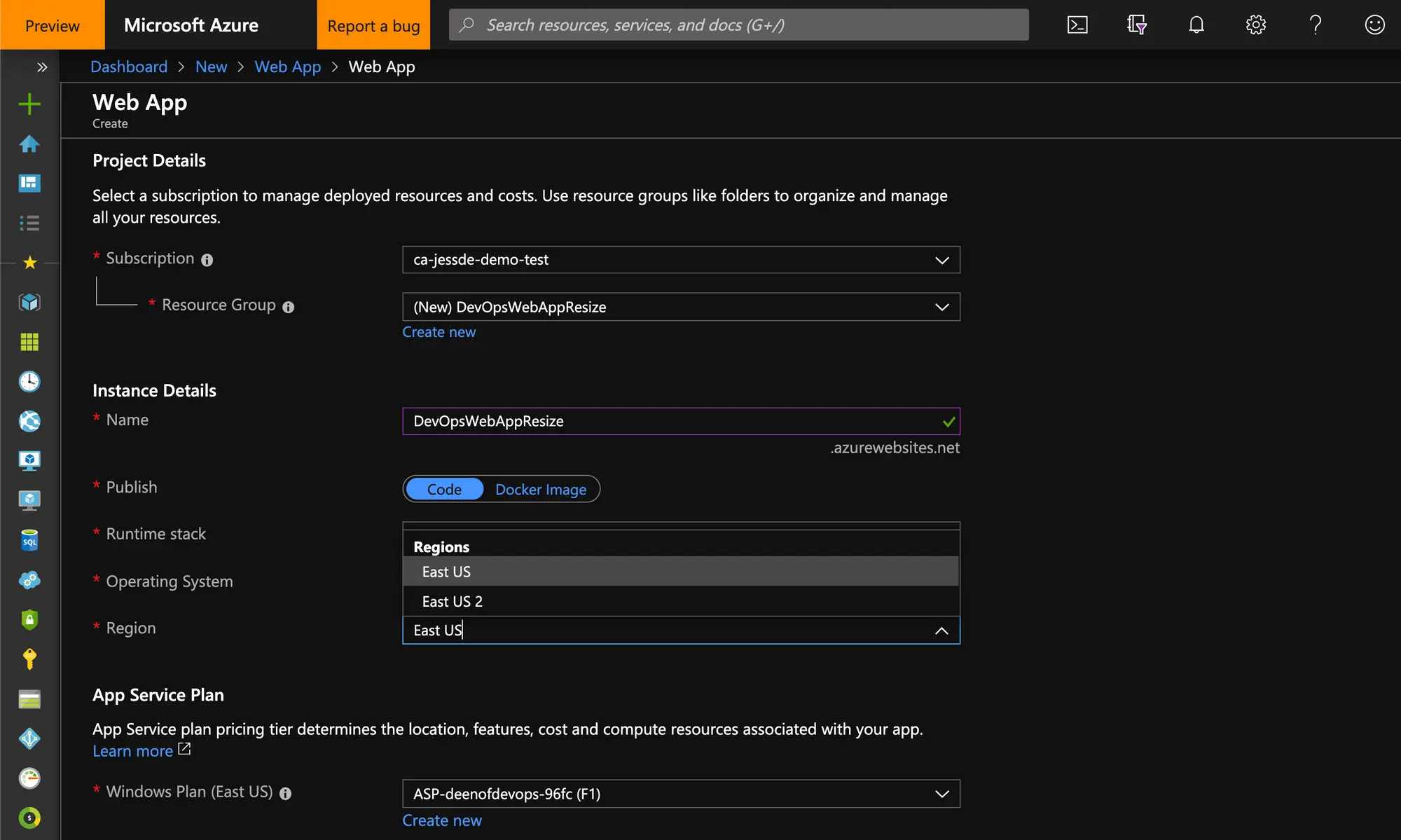 From there, you’ll just need to fill in a few key details - your resource group, app name, runtime stack, location, for your AppServicePlan, you can select the F1 Free Sku just as I did in the below example. From there, hit Review and Create.