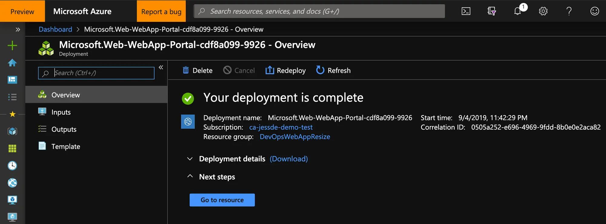 Once your deployment completes you’ll see a summary page with deep links over to your build, release and successful Azure Pipelines and Deployment.